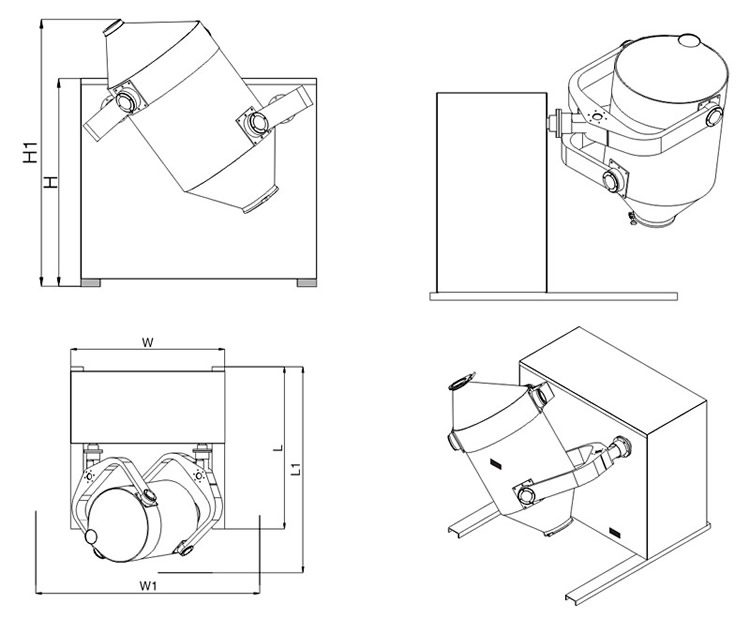 該機工作時,混科器具有三維空間運動,在進行自轉(zhuǎn)的同時進行公轉(zhuǎn),混料器一方面具有強烈的湍動作用,加速了物料的流動和擴散,另一方 面有翻轉(zhuǎn)和平移運動,克服了離心力的影響,使物料不會產(chǎn)生比重偏析和集聚現(xiàn)象,也無死角,保證混合均勻。