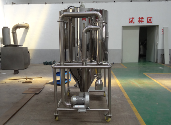 空氣經(jīng)過濾和加熱,進(jìn)入干燥器頂部空氣分配器,熱空氣呈螺旋狀均勻地進(jìn)入干燥室。料液經(jīng)塔體頂部的高速離心霧化器,(旋轉(zhuǎn))噴霧成極細(xì)微的霧狀液珠,與熱空氣并流接觸在極短的時間內(nèi)可干燥為成品。成品連續(xù)地由干燥塔底部和旋風(fēng)分離器中輸出,廢氣由風(fēng)機(jī)排空。