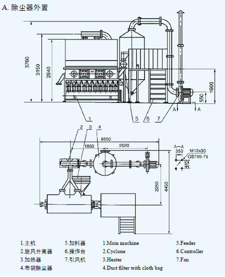 ● 沸騰干燥,又稱流化床,它是由空氣過濾器、加熱器、沸騰床主機,旋風分離器、布袋除塵器、高壓離心風機、操作臺組成,由于干燥物料的性質不同,配套除塵設備時,可按需要考慮,可同時選擇旋風分離器、布袋除塵器,也可選擇其中一種,一般來說比重較大的如沖劑及顆粒物料干燥只需選擇旋風分離器,比重較輕的小顆粒狀和粉狀物料需配套布袋除塵器,并備有氣力送料裝置及皮帶輸送機供選擇。